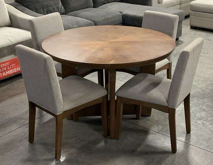 The set includes four upholstered dining chairs with light gray fabric covering both seat and back. Chair frames feature tapered wooden legs in matching medium-toned finish with simple, straight lines. The upholstery appears to be a neutral linen-blend or polyester fabric suitable for everyday dining use.